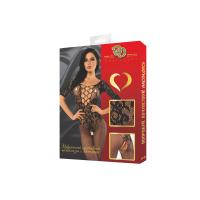 Эффектный кетсьюит полностью закрывает ноги, подчеркивая их стройность и зрительно увеличивая длину. При этом зона промежности остается открытой,  костюм не придется снимать при завершении прелюдии. Его можно надевать без нижнего белья или комбинировать с бюстгальтером, он отлично подойдет для смелых экспериментов в постели. Эластичный материал легко растягивается, зона декольте дополнена глубоким вырезом и переплетением  тонких веревочек , что делает образ еще более соблазнительным! Выполнен из мелкой сеточки  с ажурным орнаментом по полочке, спинке и рукавам.
