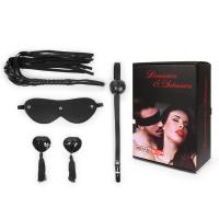 Великолепный набор аксессуаров для любителей БДСМ-игр. В комплект входят плеть, кляп, маска и пэститы для украшения сосков.