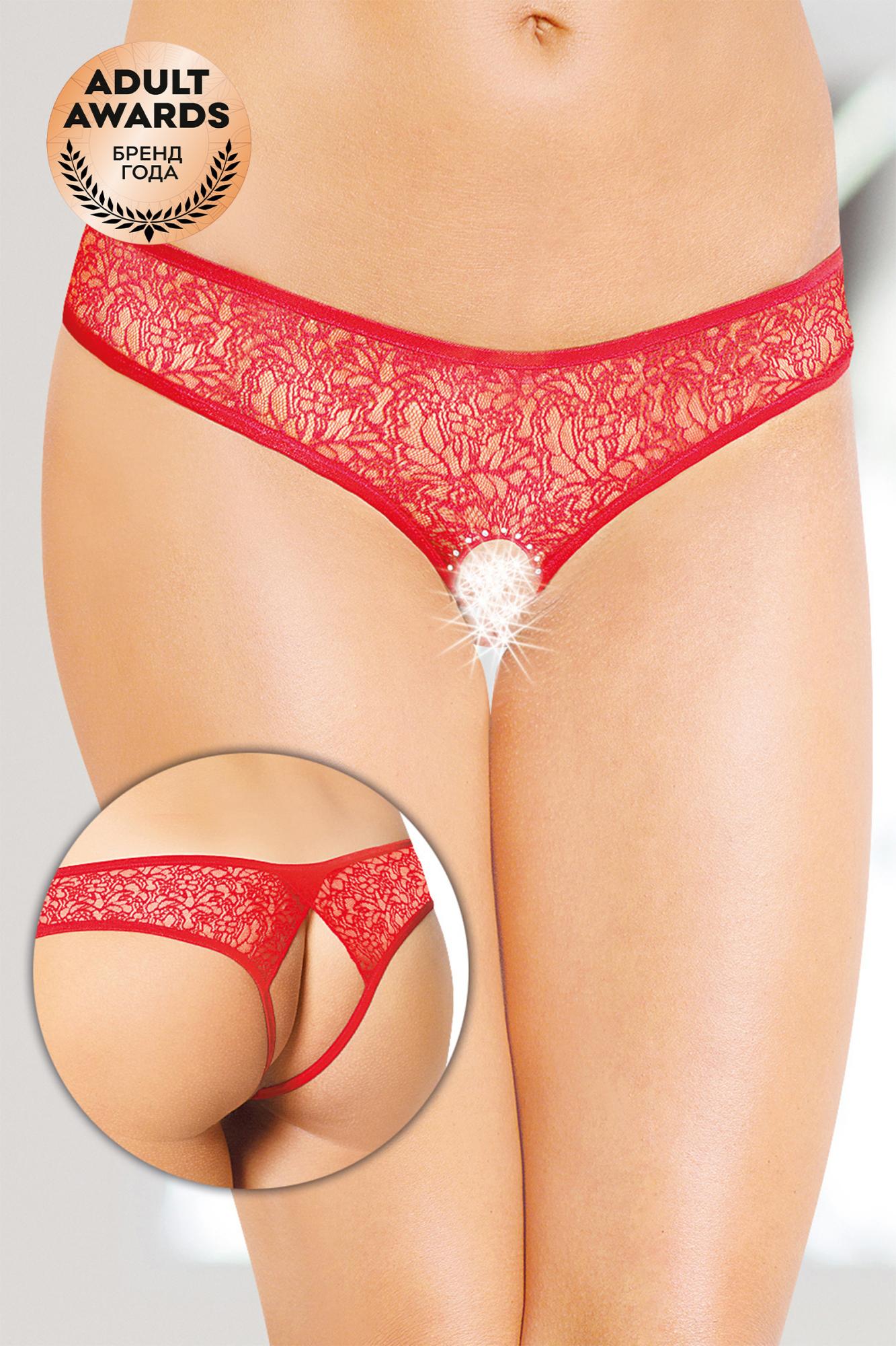 Стринги с доступом, выполненные из фактурного кружева, вырез в интимной зоне декорирован стразами.