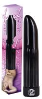 Черный гладкий вибратор с рельефным основанием и загнутым кончиком. С многоскоростной вибрацией. Размер: 13 см, Ø 2,5 см. Материал: АБС-пластик.